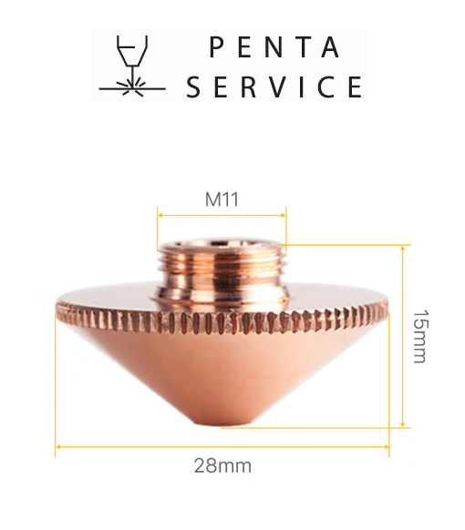 Сопло PENTA SERVICE высотой 15 мм, диаметром 28 мм, имеет диаметр отверстия 1,0 мм и резьбу М11, произведено из меди с соблюдением всех необходимых стандартов качества, технических и геометрических параметров изделий данного типа. В результате применения, сопло гарантирует сохранение расчётных параметров в течение длительного времени и обеспечивает высокую мощность работы оборудования лазерной резки.